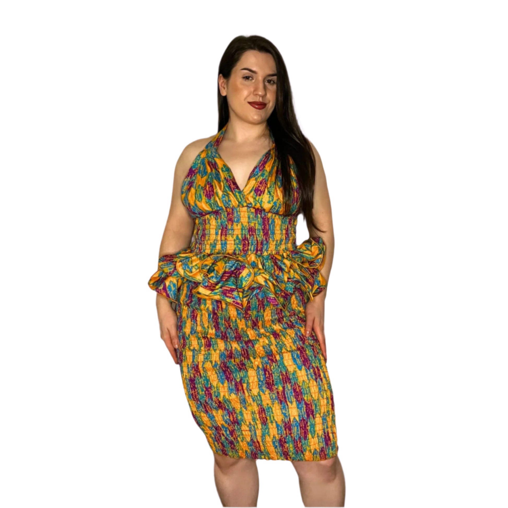 Fitted to Flatter! The shirred mini skirt adjusts to your shape, while the halter neck top gives you that sleek, sophisticated edge. Perfect for any occasion!